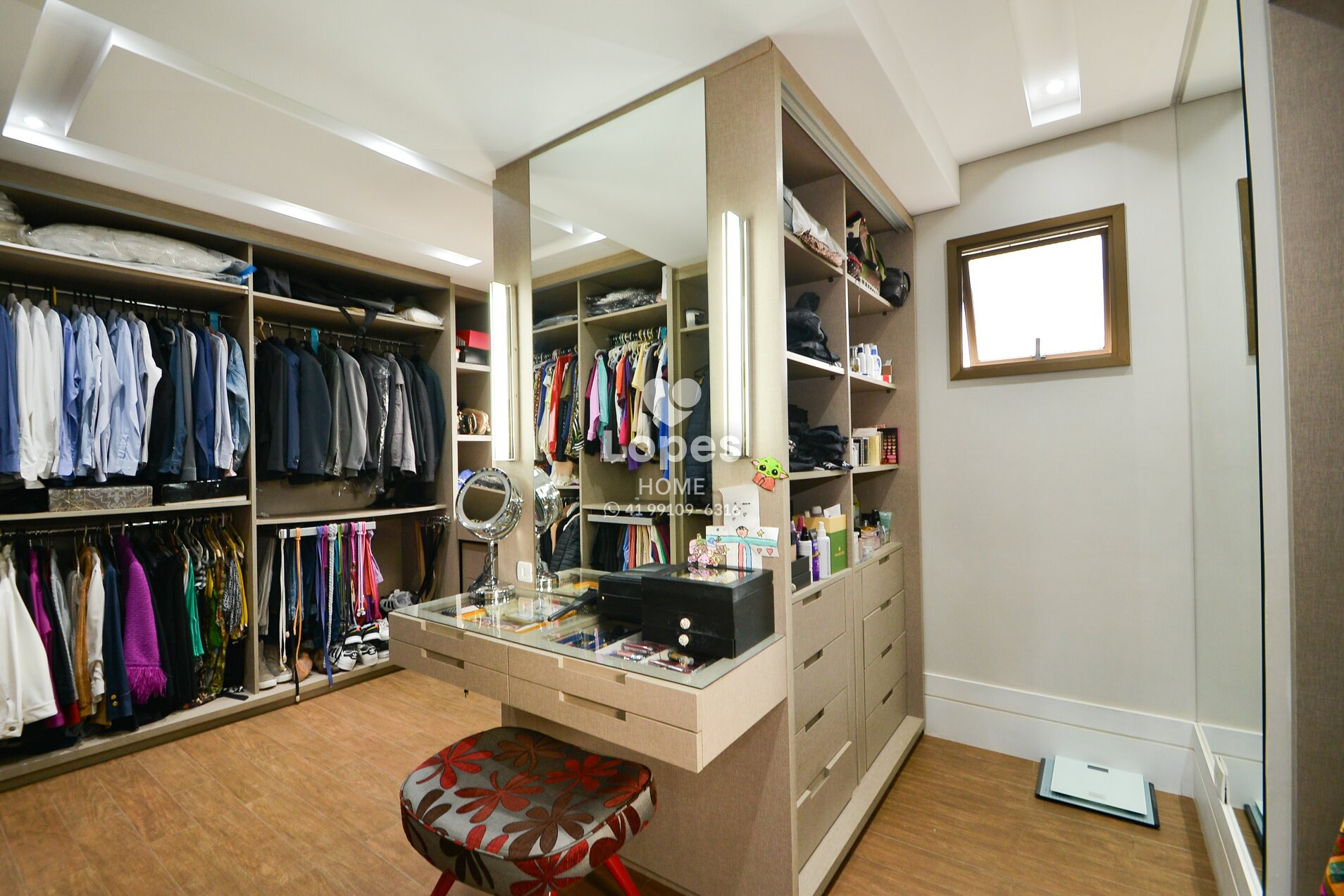 Suíte master com amplo closet repleto de armários e banheira de hidromassagem